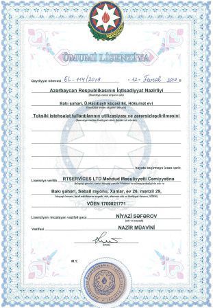 • License for toxic waste utilization & disposal issued by the Ministry of Economy # EL-114/219(Azerbaijan)